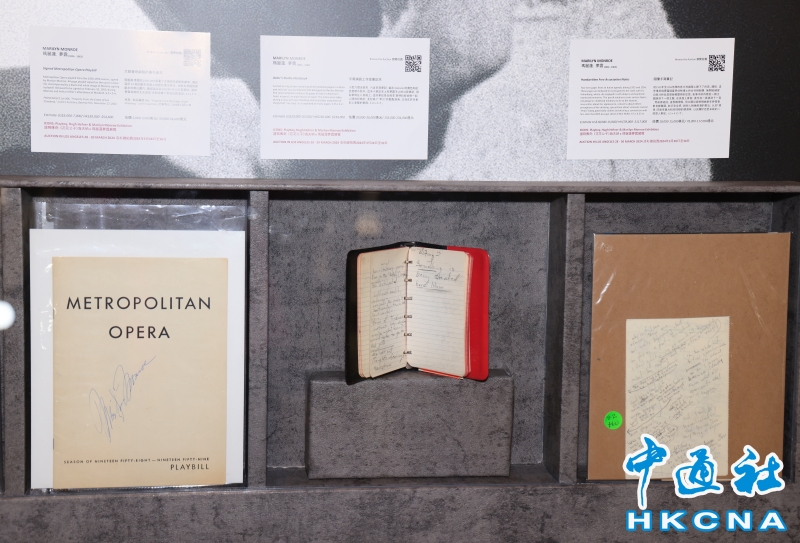 “譜寫傳奇:《花花公子》休·海夫納 x 瑪麗蓮·夢露”將於1月 27日至2月1日在香港中環藝穗會開展,免費展出瑪麗蓮·夢露和《花花公子》創立人休·海夫納的逾50件珍貴藏品。圖爲瑪麗蓮·夢露親筆簽名的紐約大都會歌劇院1958-1959 演出季度節目單,附有一張她為節目單簽名的黑白照片(左)。(香港中通社記者 曹文毓攝) 香港中通社圖片