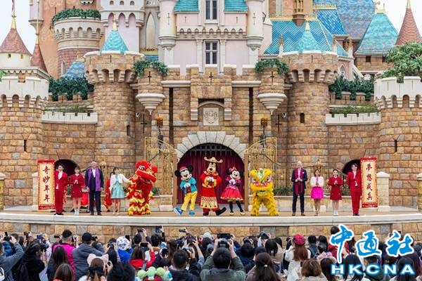 •   香港迪士尼樂園2月10日與賓客慶祝農歷新年,喜迎奇妙龍年。 香港迪士尼樂園度假區行政總裁莫偉庭 (Michael)、營運高級副總裁施保添 (Tim)、兩位親善大使謝承恩 (Beyan) 及珮芷善 (Gisele),連同米奇老鼠、米妮老鼠、財神高飛向賓客拜年,與大家一同迎龍接福。 香港中通社圖片