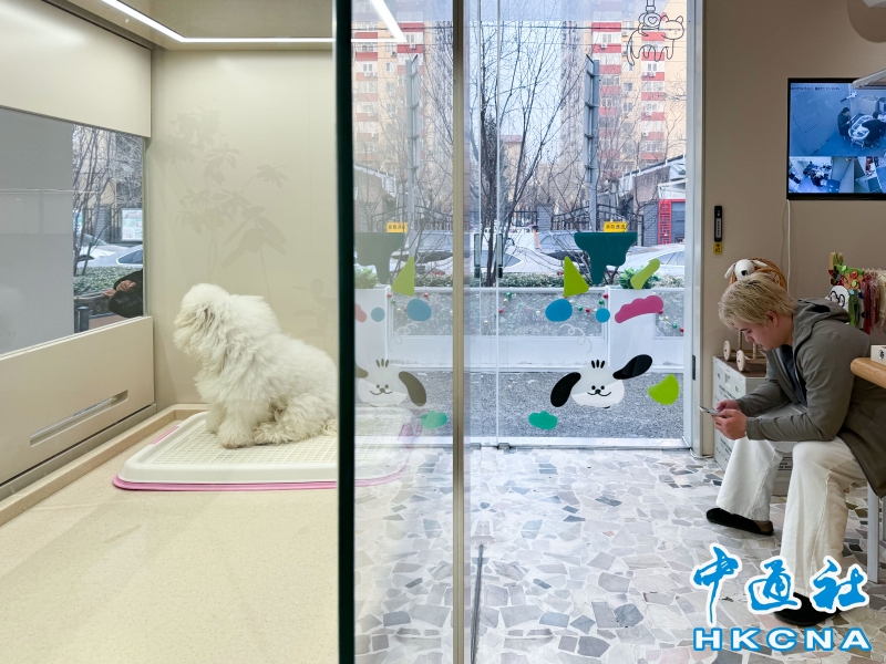 •     2月18日,一位寵物主在寵物店內等待領取寄養在此的寵物狗。 香港中通社圖片