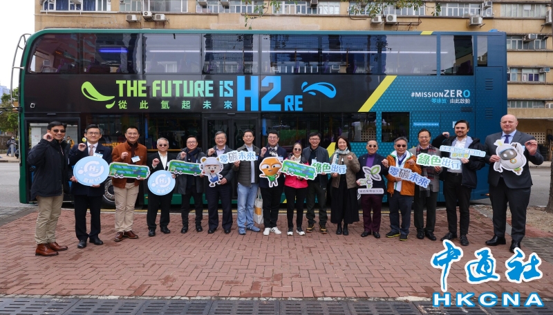 •   香港“綠色出行 零碳未來”新能源巴士體驗日暨嘉年華3月2日在建造業零碳天地舉行。圖為環境及生態局副局長黃淑嫻(右八)、環境運動委員會主席黃傑龍教授(左七)、環境及自然保育基金委員會主席鄭錦鐘博士(左五)、運輸及物流局副局長廖振新(右七)及其他嘉賓於雙層氫能巴士前合照。 香港中通社圖片
