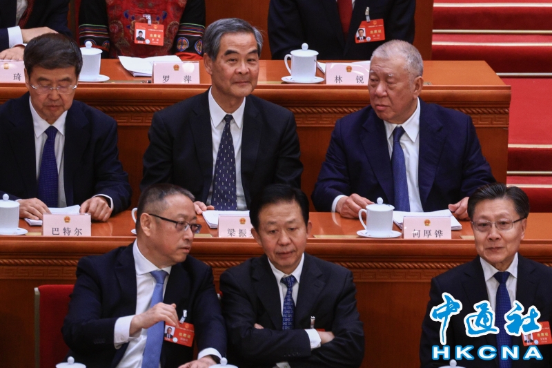 •   3月8日,十四屆全國人大二次會議在北京人民大會堂舉行第二次全體會議。全國政協副主席梁振英(上排左)、全國政協副主席何厚鏵(上排右)列席會議。(香港中通社記者 許其皓攝) 香港中通社圖片