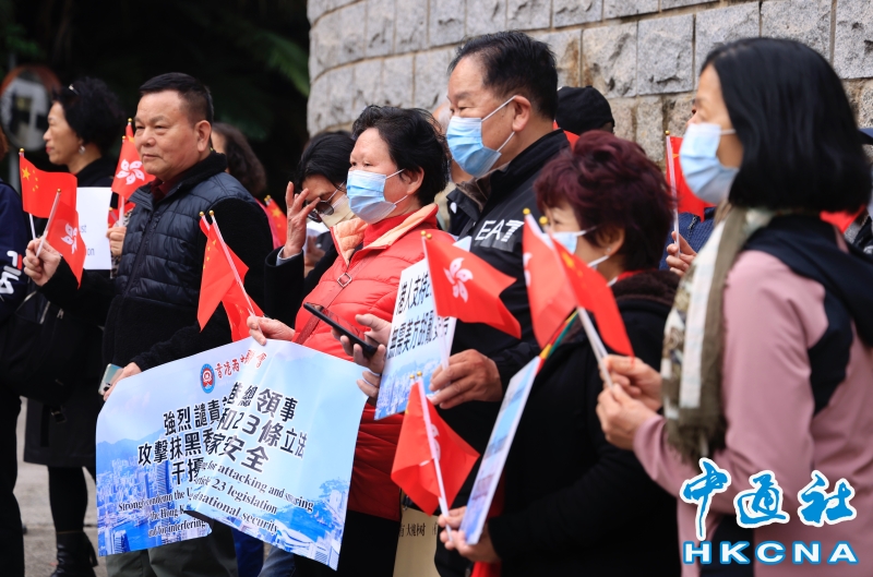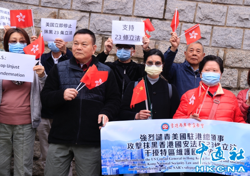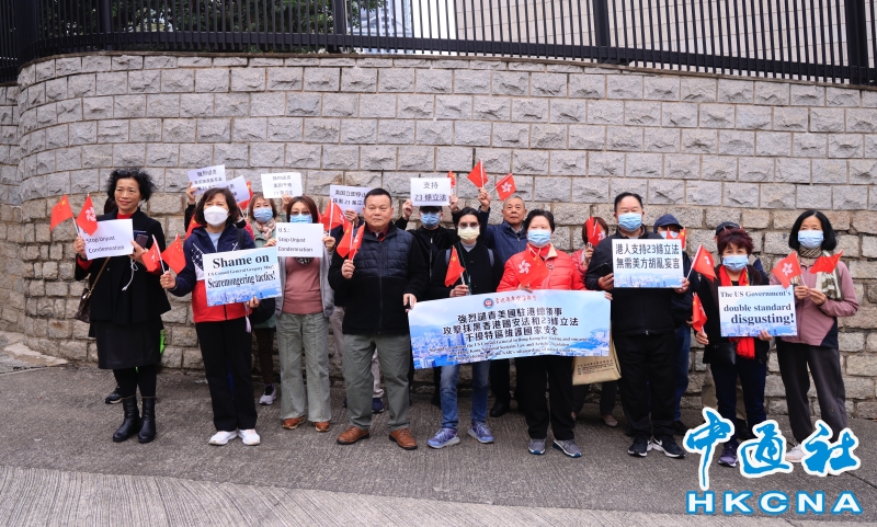 •   3月9日,香港兩岸客家聯會在美國駐港總領事館前抗議美國駐港澳總領事梅儒瑞干涉中國內政和香港事務。(香港中通社記者 曹文毓攝) 香港中通社圖片