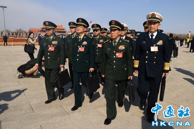 3月11日,十四屆全國人大二次會議在北京人民大會堂舉行閉幕會。圖為解放軍和武警代表團走向人民大會堂。(香港中通社記者 許其皓攝) 香港中通社圖片