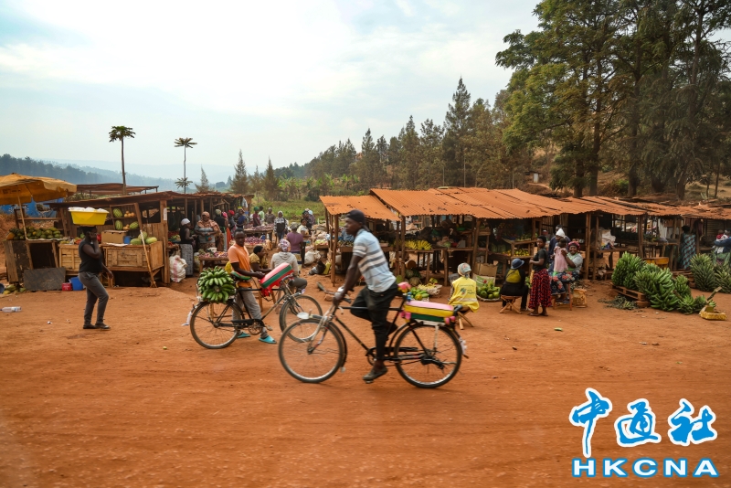 盧旺達共和國是中非東部主權國家,人口主要居住在農村地區,以年輕人為主,密度在非洲國家中位居前列。中通社記者近日實地探訪盧旺達首都基加利一村落,發現當地生活方式趨於原始,大量房屋用泥磚建造,隱藏在田地之間。村民通常使用黃色水桶集中來到一處河流地點接取所有生活用水,屋內也並未設有廁所或浴室。道路中央放眼望去紅土一片,由於長旱季,塵土飛揚,甚至染紅了大部分綠葉;道路兩旁多為田地,種植大量香蕉、牛油果等作物,因此當地食物亦多選用香蕉直接烹飪。由於村落內大量房屋尚未通電,因此村民通常日落而息。圖為村落內市集。(香港中通社記者 曹文毓攝) 香港中通社圖片