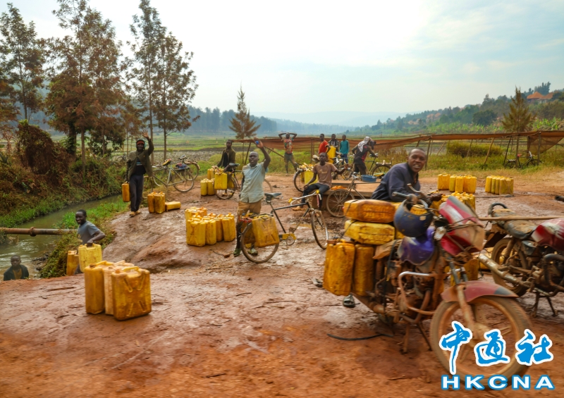盧旺達共和國是中非東部主權國家,人口主要居住在農村地區,以年輕人為主,密度在非洲國家中位居前列。中通社記者近日實地探訪盧旺達首都基加利一村落,發現當地生活方式趨於原始,大量房屋用泥磚建造,隱藏在田地之間。村民通常使用黃色水桶集中來到一處河流地點接取所有生活用水,屋內也並未設有廁所或浴室。道路中央放眼望去紅土一片,由於長旱季,塵土飛揚,甚至染紅了大部分綠葉;道路兩旁多為田地,種植大量香蕉、牛油果等作物,因此當地食物亦多選用香蕉直接烹飪。由於村落內大量房屋尚未通電,因此村民通常日落而息。圖為村民在小河邊打水。(香港中通社記者 曹文毓攝) 香港中通社圖片