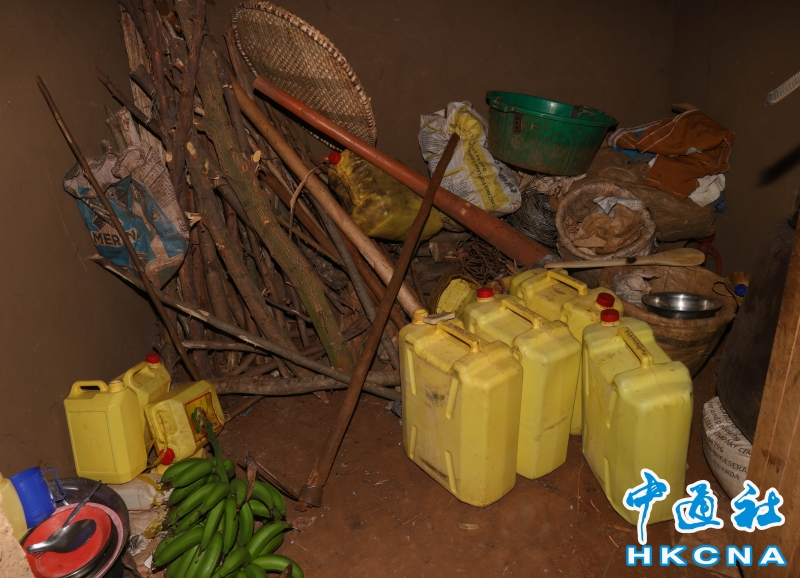 盧旺達共和國是中非東部主權國家,人口主要居住在農村地區,以年輕人為主,密度在非洲國家中位居前列。中通社記者近日實地探訪盧旺達首都基加利一村落,發現當地生活方式趨於原始,大量房屋用泥磚建造,隱藏在田地之間。村民通常使用黃色水桶集中來到一處河流地點接取所有生活用水,屋內也並未設有廁所或浴室。道路中央放眼望去紅土一片,由於長旱季,塵土飛揚,甚至染紅了大部分綠葉;道路兩旁多為田地,種植大量香蕉、牛油果等作物,因此當地食物亦多選用香蕉直接烹飪。由於村落內大量房屋尚未通電,因此村民通常日落而息。圖為村民屋內廚房。(香港中通社記者 曹文毓攝) 香港中通社圖片