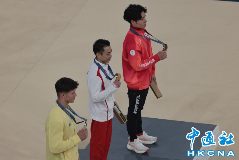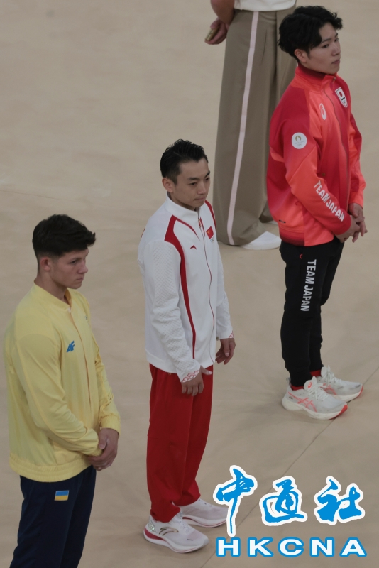 •   當地時間8月5日,在巴黎奧運會體操男子雙杠決賽中,中國選手鄒敬園獲得冠軍。圖為頒獎典禮。(香港中通社記者  謝光磊 攝) 香港中通社圖片