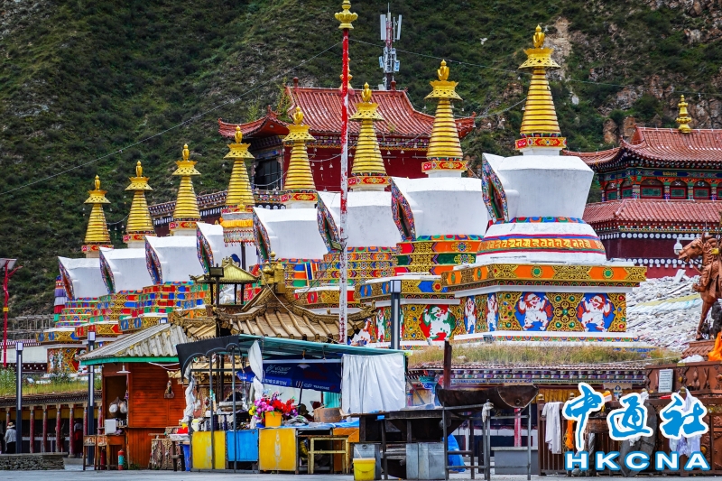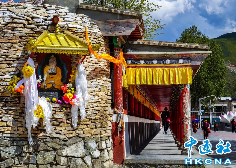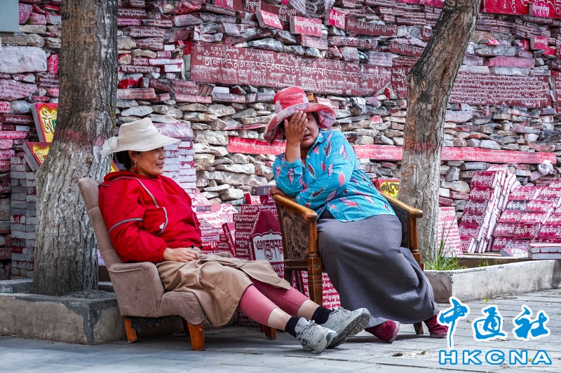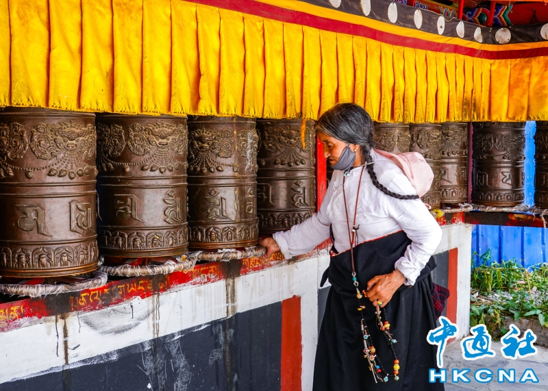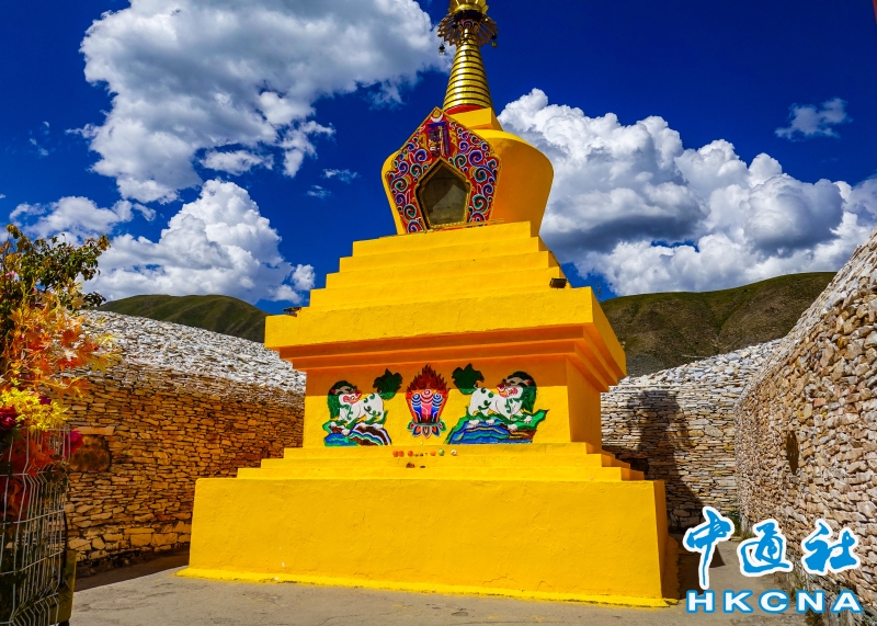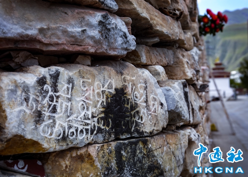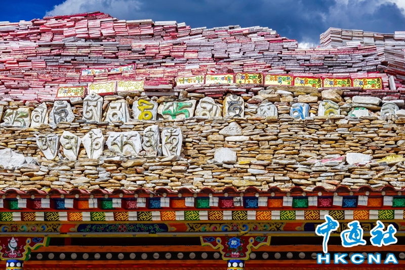 位於中國青海省玉樹藏族自治州的新寨嘉那瑪尼石城,被譽為全球最大的瑪尼堆。當地藏民在白石刻寫經文和吉祥圖案,飾以五彩,“瑪尼”有吉祥之意,只可添不可減,300多年來累積的25億塊瑪尼石形成了長近300米、寬80米、高3米的宏偉石經牆,2010年玉樹地震導致牆體坍塌,約10天後便開始修復。經幡、白塔、紅石、藍天、白雲,當地藏民在這個離天很近的地方,磕頭、轉經,虔誠祈求過最簡單的日子。(香港中通社記者 陳卓儀攝) 香港中通社圖片
