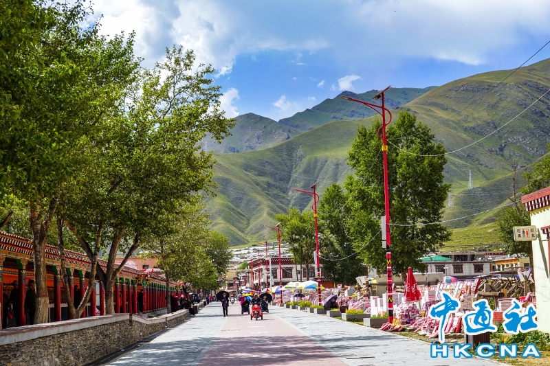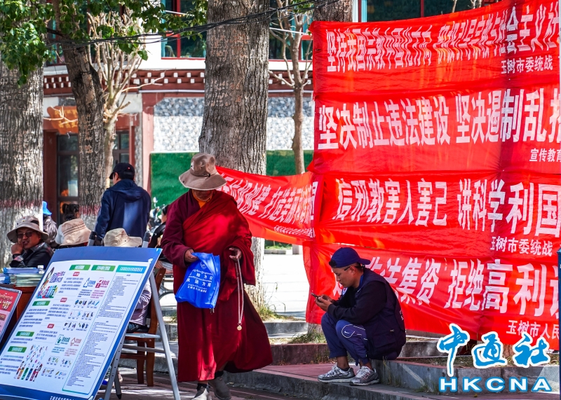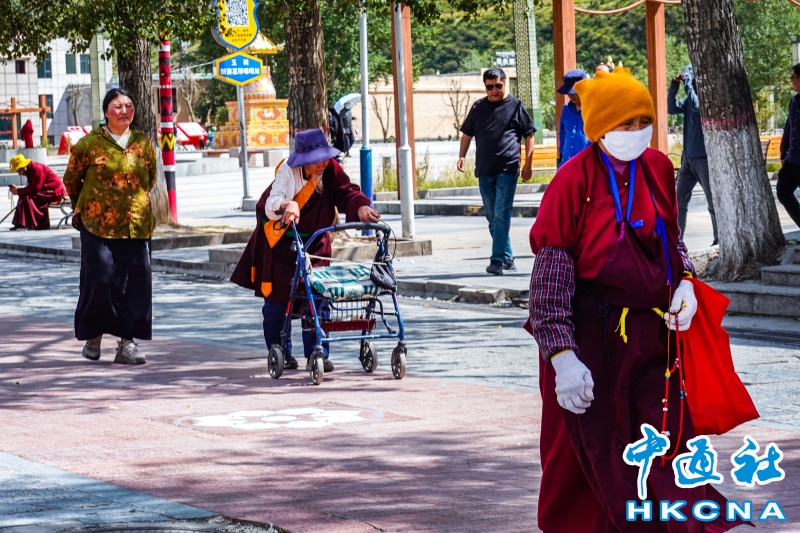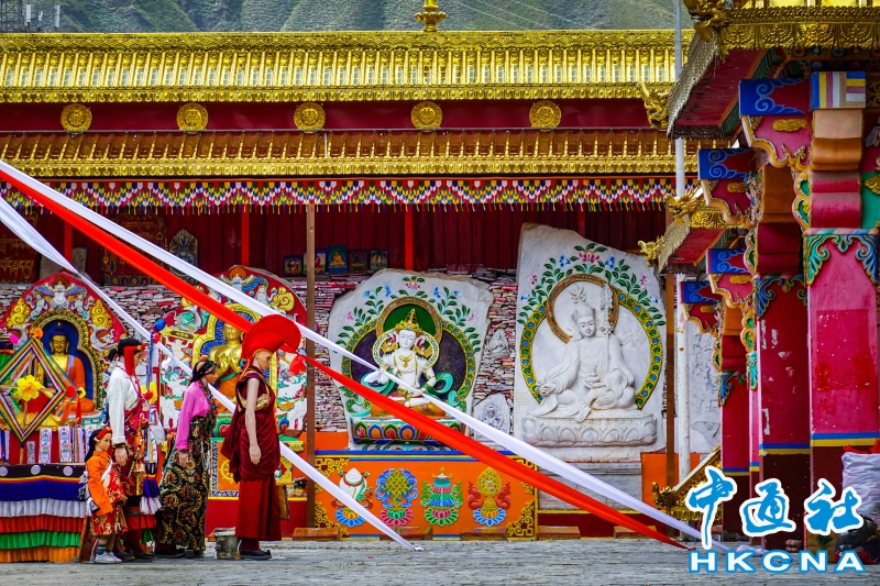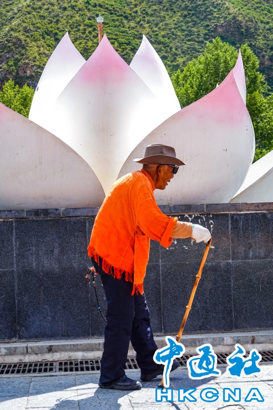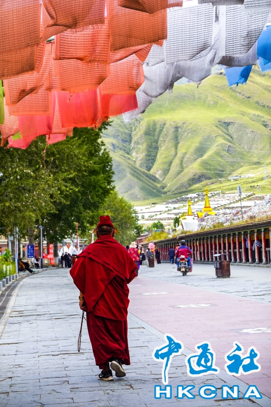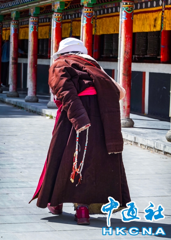 位於中國青海省玉樹藏族自治州的新寨嘉那瑪尼石城,被譽為全球最大的瑪尼堆。當地藏民在白石刻寫經文和吉祥圖案,飾以五彩,“瑪尼”有吉祥之意,只可添不可減,300多年來累積的25億塊瑪尼石形成了長近300米、寬80米、高3米的宏偉石經牆,2010年玉樹地震導致牆體坍塌,約10天後便開始修復。經幡、白塔、紅石、藍天、白雲,當地藏民在這個離天很近的地方,磕頭、轉經,虔誠祈求過最簡單的日子。(香港中通社記者 陳卓儀攝) 香港中通社圖片