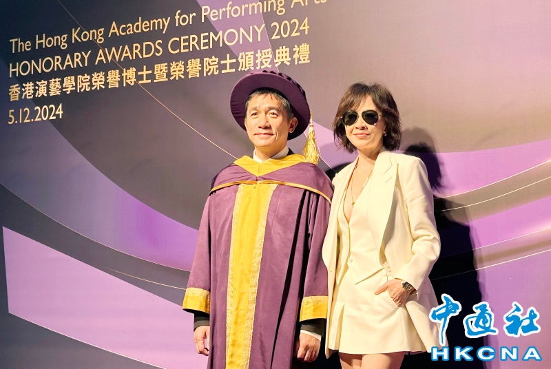 •   香港演藝學院5日頒授榮譽博士予三位演藝界人士許鞍華、洪金寶及梁朝偉。圖為香港演員梁朝偉及其太太劉嘉玲。(香港中通社記者 徐嘉儀攝) 香港中通社圖片