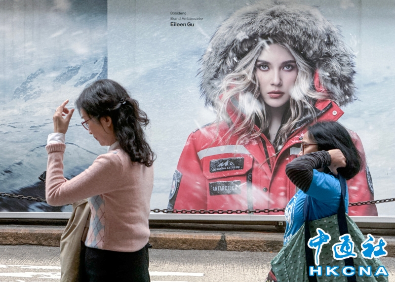 •   一股東北季候風將於11日晚抵達華南沿岸,香港天文台表示,本周後期至下周初氣溫逐步下降,早晚相當清涼,很可能打破今年入冬以來最低溫度紀錄,而新界氣溫會較市區再低兩三度,達到寒冷水平。圖為市民途經中環一個買禦寒衣服的廣告牌。(香港中通社記者 徐文峰攝) 香港中通社圖片