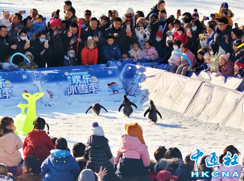 •     2024年12月28日,北京市紫竹院公園內上演企鵝巡游,民眾與企鵝熱情互動。 香港中通社圖片