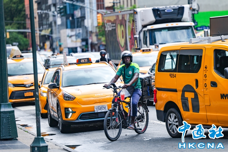 •   美國紐約曼哈頓鬧區當地時間5日開始徵收“堵車費”,以紓緩交通擠堵,成為全美首例。當天起,一般汽車在繁忙時段進入曼哈頓中央公園以南地區,須支付9美元。小型貨車和非通勤巴士須支付14.4美元;大型貨車和旅遊巴須支付21.6美元。圖為市民騎著自行車穿梭於擁塞的曼哈頓街頭。 (香港中通社記者 徐文峰攝) 香港中通社圖片