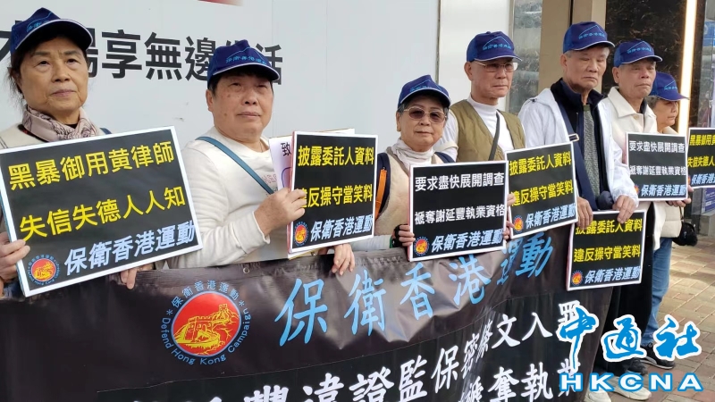 •   1月13日,香港“保衛香港運動”一批成員到中環永安集團大廈地下集會“聲討謝延豐律師”,強烈要求香港律師會對首位違反《證券及期貨條例》保密條文遭定罪的律師謝延豐之專業失德,採取全面調查 ; 並盡快採取包括吊銷其執業牌照在內的紀律處分。 香港中通社圖片