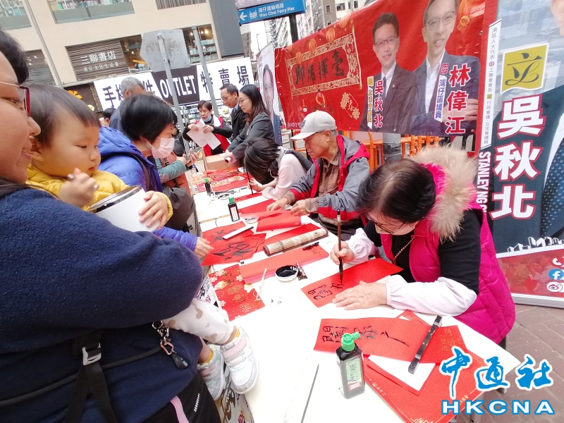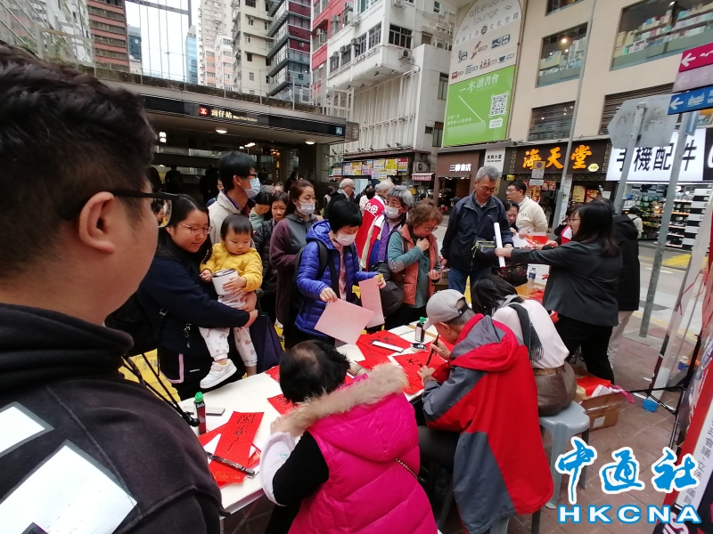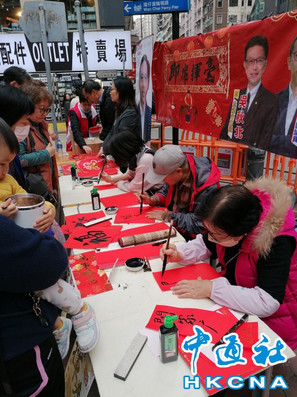•   農曆新年前夕,香港工聯會議員和義工在街頭為市民寫揮春對聯,為春節添喜慶。 香港中通社圖片