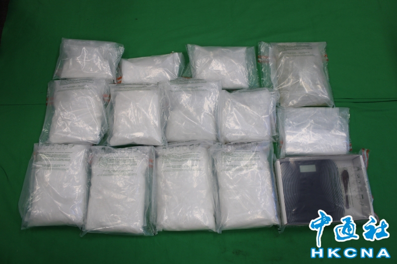 •   1月15日,香港海關公佈1月14日在銅鑼灣進行反毒品行動,檢獲約三十一點五公斤懷疑冰毒、約二點五公斤懷疑液態冰毒以及一批毒品包裝工具。圖為檢獲的懷疑毒品及毒品包裝工具。 香港中通社圖片