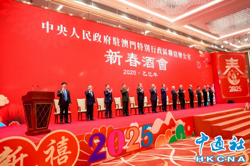•   1月16日,主禮嘉賓在新春酒會上祝酒。當日,中央人民政府駐澳門特別行政區聯絡辦公室新春酒會在中葡平台綜合體舉行。 香港中通社圖片