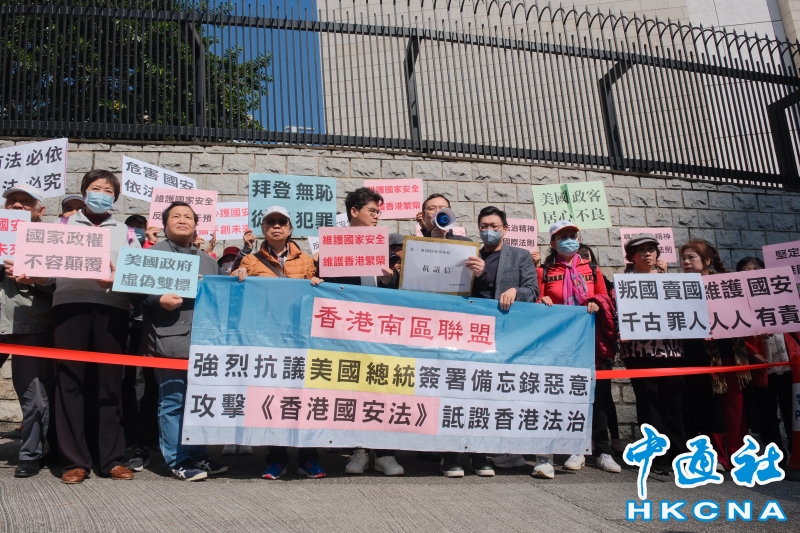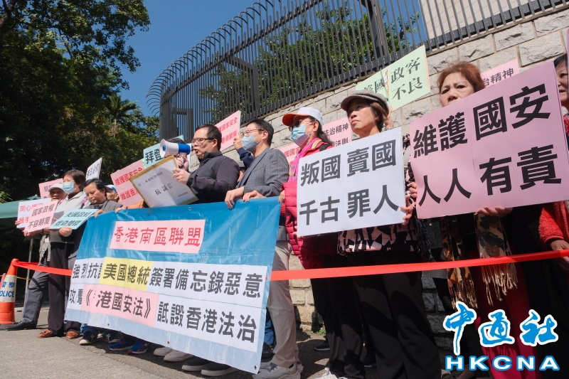 •   1月17日,香港有市民到美國駐香港總領事館外抗議,譴責美國總統簽署備忘錄惡意攻擊《香港國安法》,詆毀香港法治。(香港中通社記者 許其皓攝) 香港中通社圖片