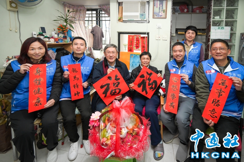 •   香港政務司副司長卓永興(左三)聯同油尖旺民政事務專員余健強(前排右二)、油尖旺區議員鍾澤暉(右一)和油尖旺區櫻桃地區服務及關愛隊伍,1月26日到大角咀向獨居長者拜早年。 香港中通社圖片