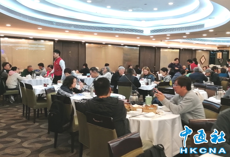 •   1月28日,香港市民在酒樓聚餐歡度除夕。除夕一餐團年飯必不可少。 香港多家餐館訂座率“爆升”,有餐飲界人士預料,農歷新年期間中式酒樓生意額有望按年增約逾一成,希望“旺丁又旺財”。 香港中通社圖片