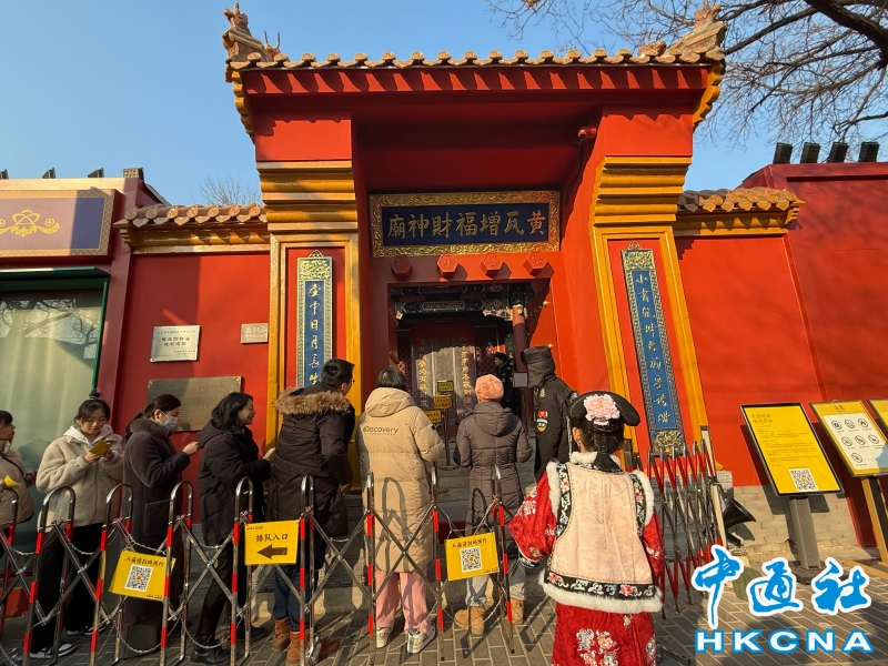 •     2025年1月24日,北京市黃瓦增福財神廟門口,民眾排隊等待入廟參觀拜財神。 香港中通社圖片
