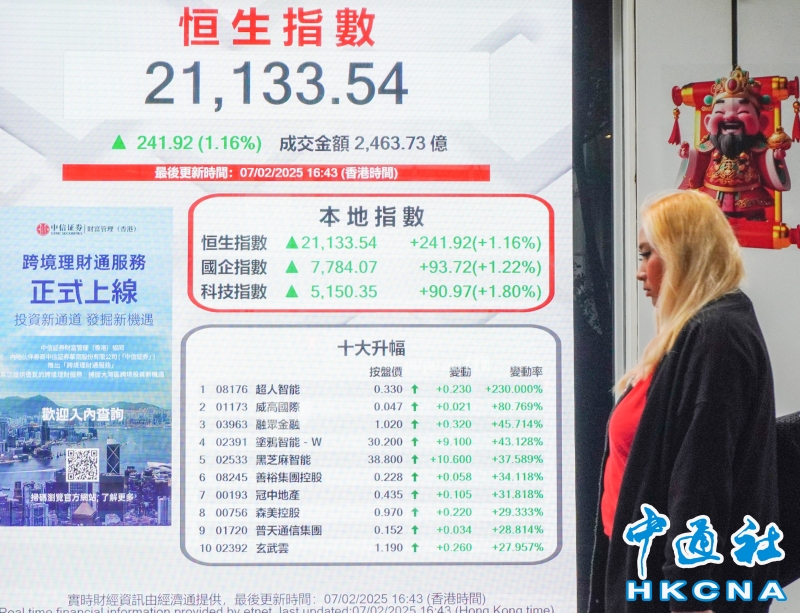 •   2月7日,截至收盤,香港恒生指數漲241.92點,漲幅1.16%,報21133.54點,主板全天成交2463.73億港元。港股連升兩日,是近2個月以來最高。當天,恒指初段曾跌逾80點,之後轉升,最多升逾320點,收市報21133點,升241點,升幅近1.2%,創近4個月以來收市高位。(香港中通社記者 曹文毓攝) 香港中通社圖片