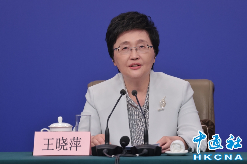 3月9日,十四屆全國人大三次會議在北京梅地亞中心舉行記者會,民政部部長陸治原、人力資源和社會保障部部長王曉萍、住房和城鄉建設部部長倪虹、國家衛生健康委員會主任雷海潮就民政、就業和社會保障、住房、衛生健康等相關問題回答中外記者提問。圖為人力資源和社會保障部部長王曉萍出席記者會。(香港中通社記者 謝光磊 攝) 香港中通社圖片