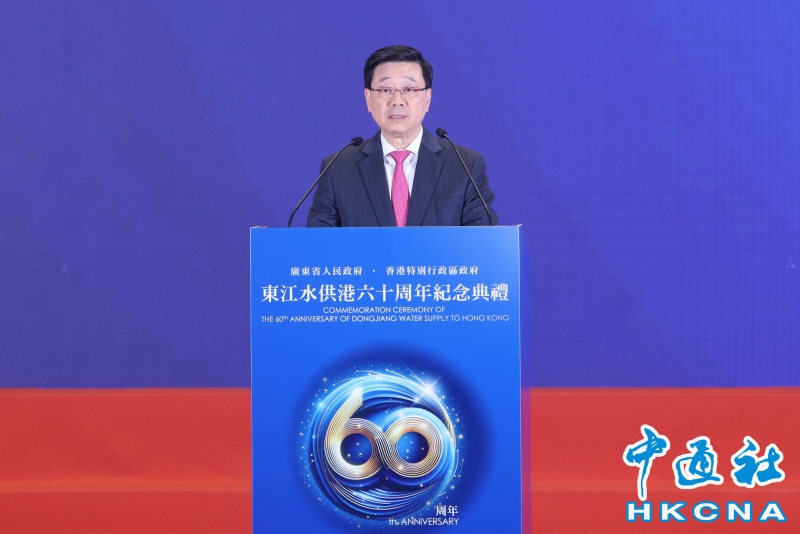 •   3月31日,粵港政府在香港特區政府總部合辦東江水供港60周年紀念典禮暨“舞動水滴展”開幕禮。圖為香港特區行政長官李家超在活動上致辭。(香港中通社記者  謝光磊 攝) 香港中通社圖片