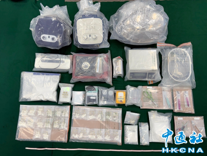 •   4月18日,香港海關公布4月17日在大埔搗破一個製毒工場,並檢獲約六百克懷疑霹靂可卡因及約五百六十克懷疑可卡因,估計市值共約一百二十萬元。圖為檢獲的懷疑霹靂可卡因、懷疑可卡因以及懷疑製毒和毒品包裝工具。 香港中通社圖片