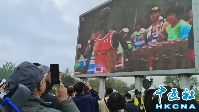 •     2025年4月19日,北京亦莊半馬靠近起點處,觀眾關注人形機器人選手的表現,通過賽事轉播為“人機共跑”拍照紀念。 香港中通社圖片