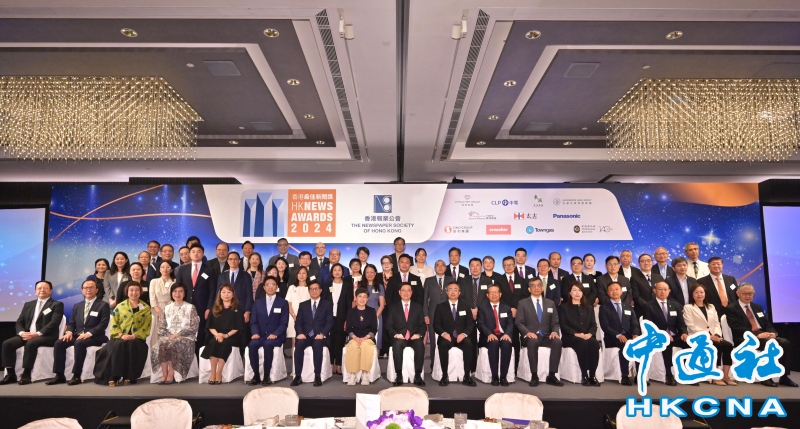 •   5月9日,香港特區行政長官李家超出席2024香港最佳新聞獎頒獎典禮暨午餐會。圖為特首李家超(第一排中)、中聯辦宣傳文體部副部長李曙光(第一排右八)、保安局局長鄧炳強(第一排左七)、政府新聞處處長廖李可期(第二排左八)、香港報業公會主席郭艷明(第一排左八),以及其他嘉賓在活動合照。 香港中通社圖片
