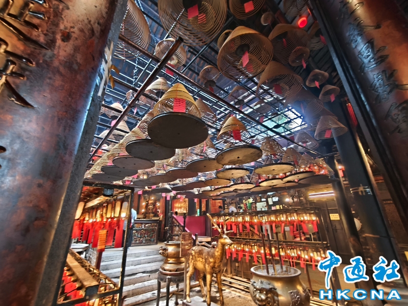 近日,香港發展旅遊熱點工作組公佈首階段旅遊熱點落實項目,公佈九個旅遊熱點項目,包括能回溯香港工業品牌變遷、中環citywalk(漫步)、生態遊,再闖入九龍城遊歷城寨風光,並擬開放旅客熱熾期望的“打卡”熱點。在中環漫步舊城,屋頂由綠瓦鋪成的文武廟是眾多訪港遊客參觀遊覽的地方,文武廟估計建於1847至1862年間,由文武廟、列聖宮和公所三幢建築組成。文武廟主要供奉文昌及武帝(關帝);列聖宮用作供奉諸神列聖;而公所則是當時華人議事及解決紛爭的地方。文武廟內還完好地保留了鑄於1847年的銅鐘,和造於1862年的官轎。古廟屋頂的花崗石柱、花崗石門框、木雕匾額和歷史悠久的壁畫,更是巧奪天工,盡顯精湛的傳統工藝和技術,活靈活現地展示中式建築的特色。善信來文武廟,有的祈求學業猛進、有的祈求事事順景。你可以準備元寶衣紙、一紮細香、三枝長壽香及香油錢,奉上香火誠心祈福。其他供品例如生菜寓意“生財”;圓形的橘子類水果則代表圓滿和順利。文武廟除了華人信仰拜祭外,近年吸引不少外國遊客來此感受傳統文化。(香港中通社記者洪少葵攝) 香港中通社圖片