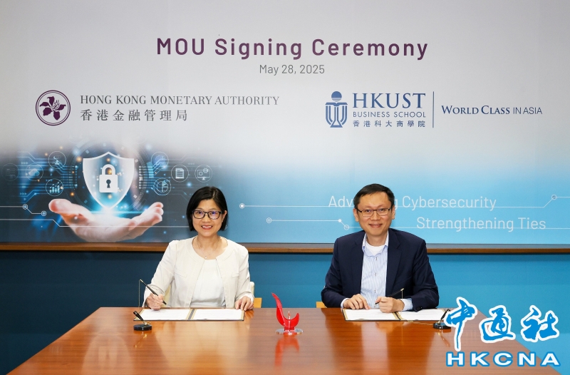 •   5月29日,香港金融管理局與香港科技大學工商管理學院宣布簽署合作備忘錄,加強在網絡安全應用研究方面的合作,切合香港金融業的需要。圖為香港金融管理局助理總裁(銀行監理)朱立翹(左)與香港科技大學工商管理學院署理院長許佳龍教授(右)簽署合作備忘錄,推動金融業的網絡安全研究。 香港中通社圖片