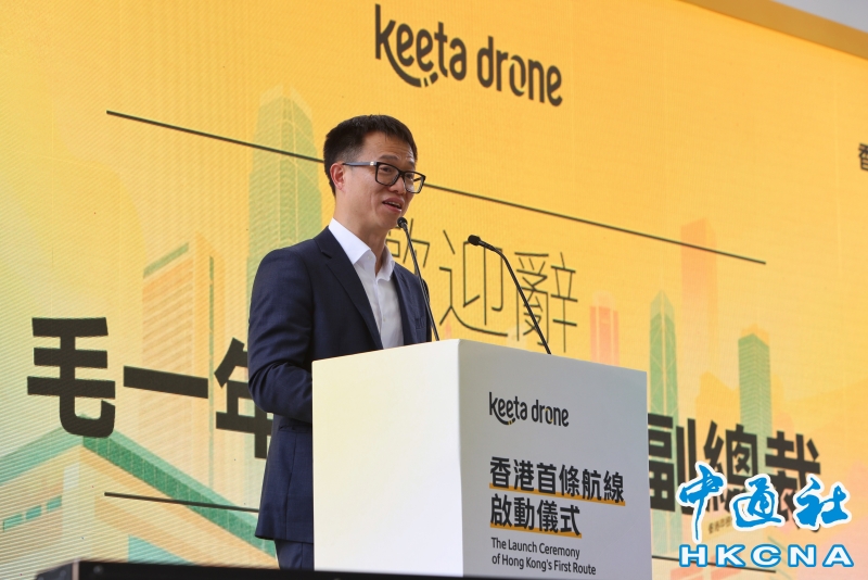 •   6月6日,美團旗下Keeta Drone宣佈,公司首條常規航線正式投入營運。新航線設在“跨海+公園”場景,無人機將由香港科學園起飛,並降落在馬鞍山海濱長廊,目前已接入服務的商戶包括麥當勞、必勝客等。圖為美團副總裁毛一年出席啟動儀式。(香港中通社記者  謝光磊 攝) 香港中通社圖片