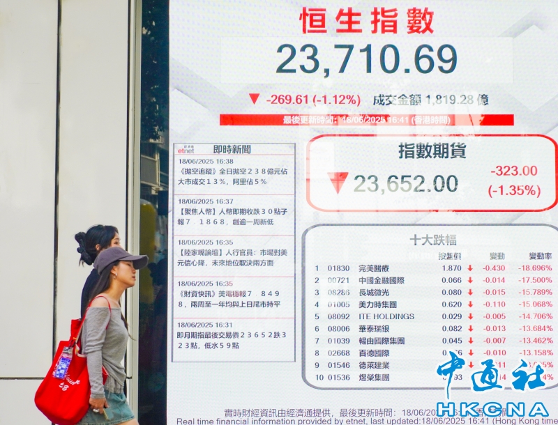 •   6月18日,截至收盤,香港恒生指數漲跌269.61點,跌幅1.12%,報23710.69點,主板全天成交1819.28億港元。(香港中通社記者 曹文毓攝) 香港中通社圖片