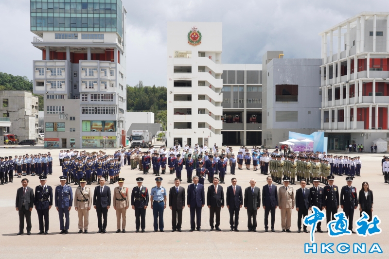 •   6月22日,香港特區政務司司長陳國基出席《香港國安法》公佈實施五周年紀律部隊及青少年團體升旗儀式。圖為陳國基(右十)、保安局局長鄧炳強(右九)和香港特別行政區維護國家安全委員會秘書長區志光(右七)與參與儀式的紀律部隊首長和主禮嘉賓合照。 香港中通社圖片