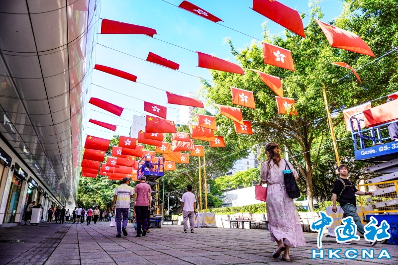 •   6月25日,香港尖沙咀街頭懸掛的中華人民共和國國旗和香港特區區旗格外耀眼,喜迎香港回歸祖國28周年。(香港中通社記者 曹文毓攝) 香港中通社圖片