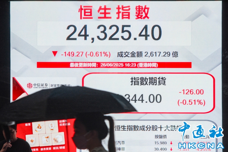 •   6月26日,截至收盤,香港恒生指數跌149.27點,跌幅0.61%,報24325.40點,主板全天成交2617.29億港元。(香港中通社記者 許其皓攝) 香港中通社圖片