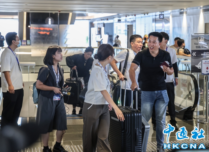 6月27日,全新升級的麗星郵輪旗下“領航星號”正式抵達香港, 以這個國際級郵輪樞紐為母港,開啟2025年郵輪航季。即日起至 11月14日,“領航星號”將以位於市中心的海港城海運碼頭為母港,推出45個往返航次,提供2晚、3晚及5晚的行程,帶領旅客探索東亞及東北亞最具魅力的旅遊目的地。圖為旅客經郵輪抵港。(香港中通社記者 曹文毓攝) 香港中通社圖片