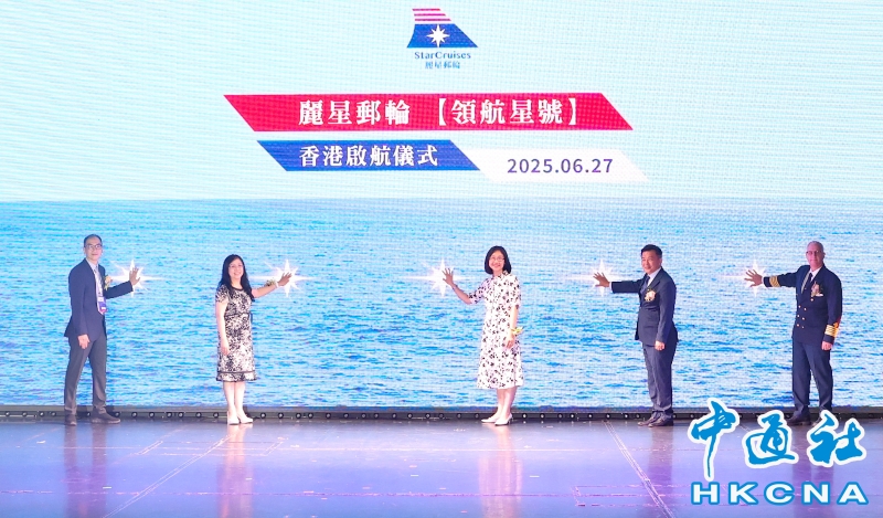 6月27日,全新升級的麗星郵輪旗下“領航星號”正式抵達香港, 以這個國際級郵輪樞紐為母港,開啟2025年郵輪航季。即日起至 11月14日,“領航星號”將以位於市中心的海港城海運碼頭為母港,推出45個往返航次,提供2晚、3晚及5晚的行程,帶領旅客探索東亞及東北亞最具魅力的旅遊目的地。圖為首航儀式。(香港中通社記者 曹文毓攝) 香港中通社圖片