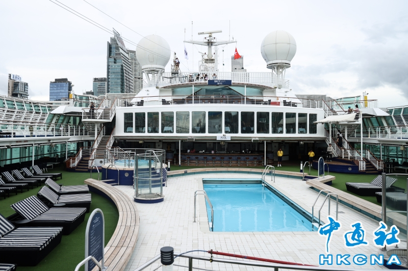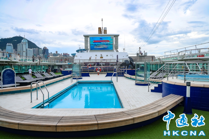 6月27日,全新升級的麗星郵輪旗下“領航星號”正式抵達香港, 以這個國際級郵輪樞紐為母港,開啟2025年郵輪航季。旅客可入住客房或升級皇宮套房,體驗船上多元設施,包括探索樂園、攀岩牆、高空滑索以及各類現場表演。同時,郵輪上亦會舉辦國際級娛樂活動,包括紅毯之夜、季節主題及泡泡狂歡派對等,並提供健身室、桑拿房、娛樂場以及兒童俱樂部,滿足不同年齡段旅客的需求。圖為泳池。(香港中通社記者 曹文毓攝) 香港中通社圖片