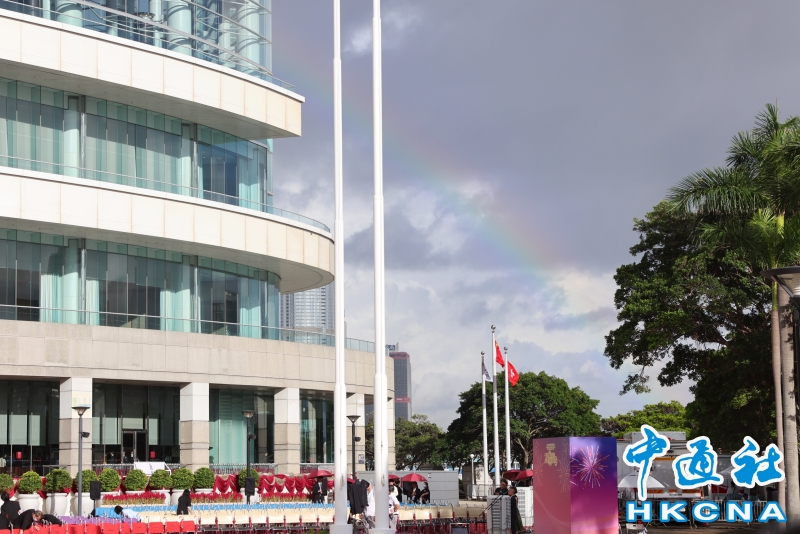 •   7月1日早上,香港特區政府在灣仔金紫荊廣場舉行升旗儀式,慶祝香港回歸祖國28周年。圖為升旗儀式開始前,維港上空出現美麗的彩虹。(香港中通社記者  謝光磊 攝) 香港中通社圖片