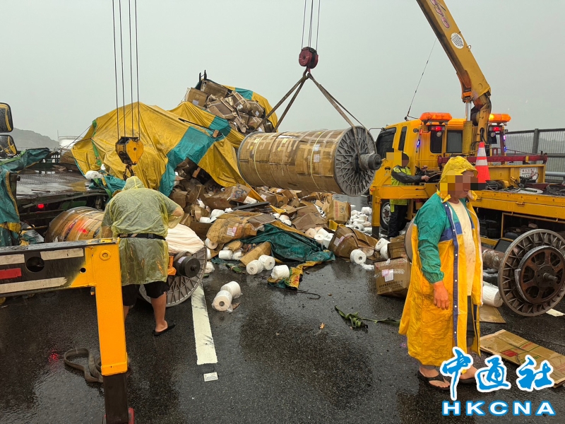 •   7月9日,台灣一輛大貨車行經第三號高速公路北向137.6公里苗栗縣西湖路段時,司機疑因分心駕駛未注意前方路況,追撞前方半聯結車,令其撞上前方大貨車車尾,肇事貨車上針織布掉落一地,所幸沒有造成人員傷亡。 香港中通社圖片