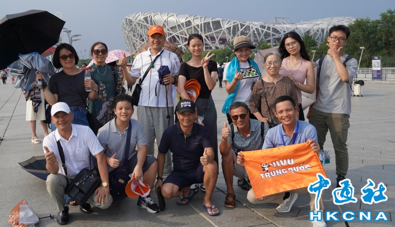 •     2025年7月11日,林俊傑演唱會在北京鳥巢開演,越南歌迷在鳥巢前合影。 香港中通社圖片
