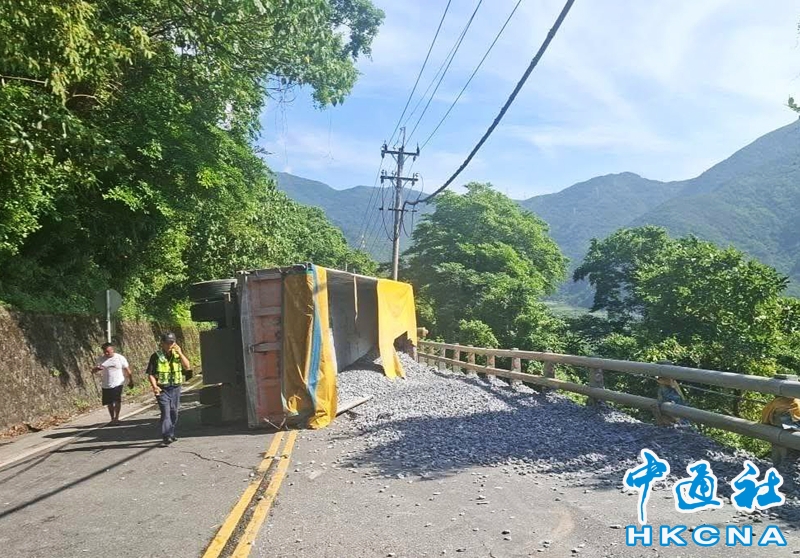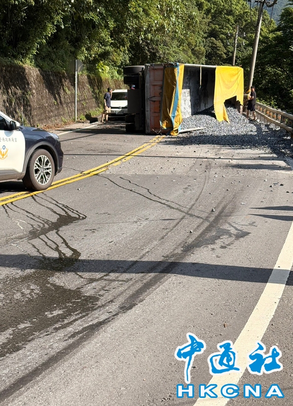 7月16日,台灣一輛滿載砂石的曳引車行經宜蘭縣蘇花公路台9線114.6K處,入彎道時疑因輪胎打滑,失控側翻,車斗內載運的砂石傾瀉一地,碎石擊中對向行駛而來的小客車擋風玻璃,所幸並未造成人員傷亡。 香港中通社圖片