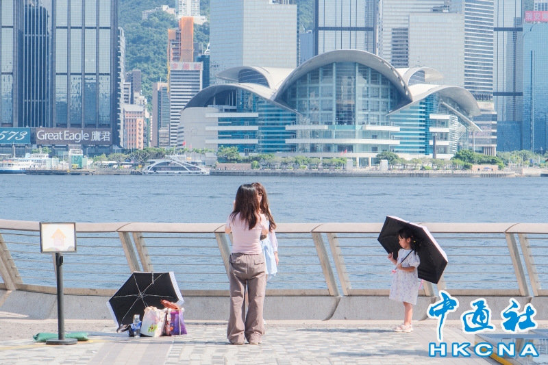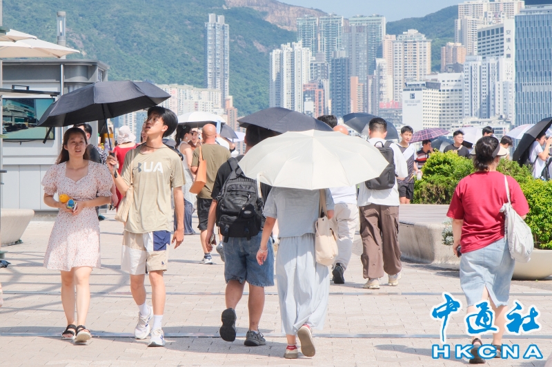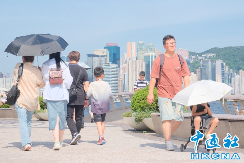 7月17日,香港天氣持續酷熱。圖為市民在烈日下出行。(香港中通社記者 許其皓攝) 香港中通社圖片