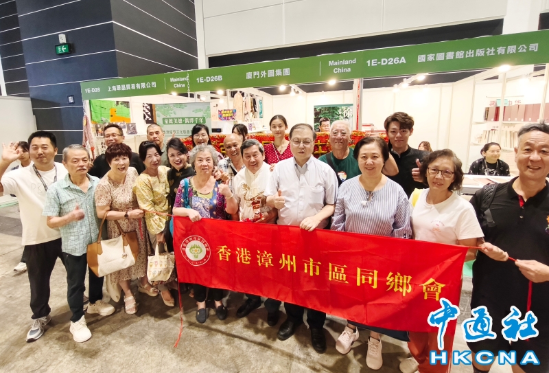 •   7月19日,正在香港會展中心舉行的第35屆香港書展上,木偶劇沉浸展演吸引眾多現場觀眾駐足欣賞。展商希望透過非遺文化的深厚底蘊,讓觀眾感受到傳統藝術的魅力。來自廈門“弘晏莊木偶皮影戲傳習中心”80多歲的藝術家莊陳華是國家級非遺項目木偶戲代表性傳承人、國家一級演員。在藝術家莊陳華和他團隊的表演下,節目精彩紛呈。圖為香港漳州市區同鄉會在會長林紹奮的帶領下,一眾鄉親特地到場觀賞木偶戲表演並和莊陳華、莊晏紅藝術家合影。 香港中通社圖片