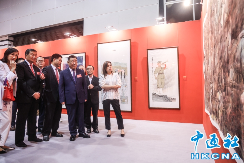 8月6日,“銘記歷史 珍愛和平——紀念中國人民抗日戰爭暨世界反法西斯戰爭勝利80周年名家名作展”在香港會展中心開幕。本次展覽,設置了銘記歷史、緬懷先烈、春回大地、江山永固、開天闢地、珍愛和平六個主題單元,展出了兩百多件藝術珍品,包括著名雕塑家吳為山創作的侵華日軍南京大屠殺遇難同胞紀念館組雕、著名畫家張仃創作的抗戰組畫、著名版畫家梁永泰創作的《戰鬥中的鐵騎》等。此外,還展出了齊白石、傅抱石、蔣兆和、李可染、李苦禪、葉淺予、何香凝、啓功、趙少昂等大師的精品力作。圖為文化體育及旅遊局局長羅淑佩、紫荊文化集團董事長許正中等人參觀展覽。(香港中通社記者 曹文毓攝) 香港中通社圖片