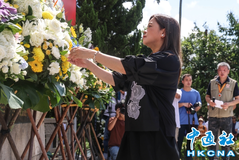 •   今年是中國人民抗日戰爭暨世界反法西斯戰爭勝利80周年。8月9日,由“原東江縱隊港九獨立大隊老游擊戰士聯誼會”主辦、西貢民政事務處贊助的“紀念抗日英烈謁碑日”儀式上午10時在香港西貢斬竹灣抗日烈士碑園舉行。原東江縱隊港九獨立大隊的老游擊戰士、中央人民政府駐香港機構代表、香港特區政府部門代表、香港立法會議員和區議員,以及社會各界團體和民眾等出席。圖為文化體育及旅遊局局長羅淑佩致送花圈。(香港中通社記者 曹文毓攝) 香港中通社圖片