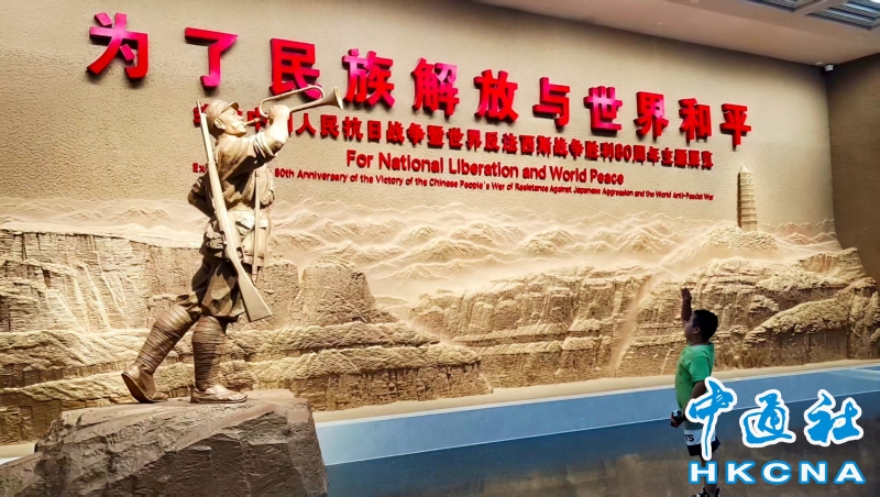 •   2025年8月15日,位於北京盧溝橋畔的中國人民抗日戰爭紀念館內,一名小男孩將右手舉過頭頂,面向抗戰士兵雕塑肅立敬禮。 香港中通社圖片